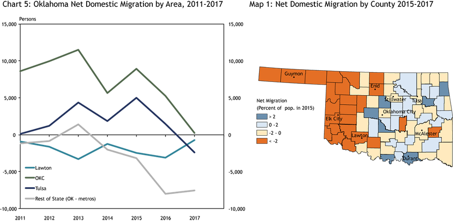 Looking across the state, the steepest drop in net domestic migration in recent years has been in nonmetro areas (Chart 5). By 2017, however, neither the Oklahoma City nor Tulsa metro areas were seeing positive net inflows of people either. Net domestic migration has been slightly negative for the Lawton metro area throughout this decade. A map of net domestic migration by county shows that all of western Oklahoma saw a sizable net outflow of people in 2016 and 2017 following the oil price drop of 2014-15, with all counties losing more than 2 percent of their populations (Map 1)._ Meanwhile, nonmetro areas in most other parts of the state generally saw only modest declines or modest increases. The only counties in Oklahoma to gain significantly from domestic migration in 2016 and 2017 were a handful of suburban counties and a few counties on the Texas and Arkansas borders.