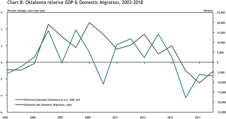 Net migration flows to and from Oklahoma in recent decades generally have mirrored the strength of the state’s economy relative to the nation. GDP in the state grew faster than the nation in most years from 2005 to 2015—years of positive net domestic migration flows. But these trends both reversed following the 2014-15 drop in oil prices and persisted through 2018, as GDP weakened and prime-aged workers moved out beginning in 2016 (Chart 8). Moreover, as the state’s economy and job opportunities became relatively worse, state government revenues declined. This resulted in sizable cuts to the Oklahoma state budget in 2016 and 2017, including to some key services for citizens such as education and health care, which may have exacerbated migration trends.