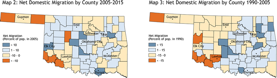 The net overall effect on population from domestic migration flows in recent decades generally is shown in Map 4, which shows total population growth by county from 1990 to 2017. During this period, most of western Oklahoma saw its population decline, despite rising domestic in-migration from 2005 to 2015. The primary exceptions were Texas County in the Panhandle and Beckham County in far western Oklahoma, homes of the regional hubs of Guymon and Elk City. Both of those counties saw their population grow by more than 15 percent since 1990, which in the case of Texas County was driven primarily by international in-migration. Woodward, Custer and Comanche Counties—each also home to regional hub cities—also saw their populations grow from 1990 to 2017, although by less than 10 percent.