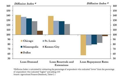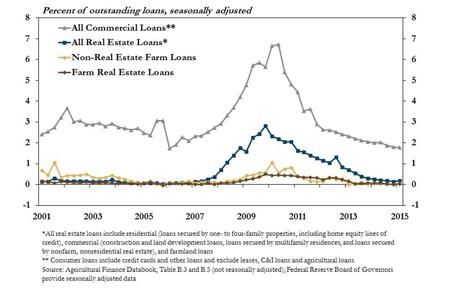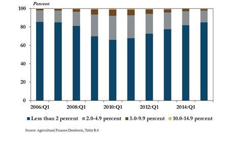 Increasing needs for short-term operating loans and expectations of lower farm income suggest a slight increase in the risk associated with agricultural production in the United States. Although agricultural credit conditions generally weakened due to further declines in farm income, farm loan delinquency rates and charge-off rates have remained low. Agricultural banks have continued to post relatively strong returns, but bankers have expressed some concern that reduced cash flows could increase future risk for the farm sector.