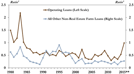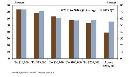 Although loan volumes have increased steadily since 2011, recent increases have coincided with a period of declining farm income. According to the USDA, crop cash receipts have declined 22 percent since 2012, but costs associated with manufactured inputs, seeds and rent declined just 1 percent in the same period. Amid growing disparity between crop revenue and input costs, the ratio of current operating loan volumes to net farm income grew significantly in 2015 (Chart 3). In fact, the ratio of operating loans to farm income continued to rise, even as other non-real estate loan volumes, relative to farm income, moderated. The recent increases in operating loans have been driven, in part, by increases in large operating loans. In the second quarter, operating loans accounted for 55 percent of all loans greater than $250,000, compared with an average of 39 percent from 2010 to 2014 (Chart 4).