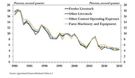 In addition to relatively stable credit risk, interest rates have also remained historically low. Average effective interest rates in the second quarter were at or below 5 percent on all types of non-real estate farm loans (Chart 6). Interest rates on farm loans, which reached a recent high of 8.7 percent in 2007, have been lower more recently and have generally trended lower since the early 1980s. Moreover, the share of non-real estate farm loans made with fixed interest rates has also risen in recent years, as borrowers have sought to lock in low rates, especially for operating loans (Chart 7).