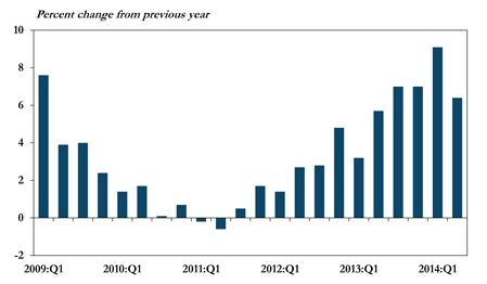 The recent survey data pointing to increased operating loan volumes have followed earlier data showing that total farm debt at commercial banks grew in the first quarter of 2015. According to commercial bank call report data, outstanding farm sector debt increased 9.3 percent from the first quarter of 2014 (Chart 8). Farm debt has continued to increase since the fourth quarter of 2011, and generally at a more rapid pace. Both real estate and non-real estate agricultural lending expanded significantly—8.0 percent and 10.8 percent, respectively—from the first quarter of 2014.