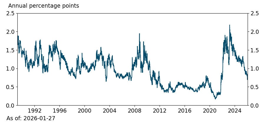 The KC PRU is constructed using the same methodology as the Chicago Board Options Exchange Volatility Index (Cboe VIX) on Chicago Mercantile Exchange’s (CME) options data. We use Eurodollar contracts prior to 2023 and contracts on the Secured Overnight Financing Rate (SOFR) from 2023 onward. The Economic Review article "Introducing the Kansas City Fed’s Measure of Policy Rate Uncertainty" provides further details on the index, including a technical appendix describing the measure’s construction. Included below are a downloadable CSV and a plot of the entire history of the KC PRU. Data are updated on a daily basis.