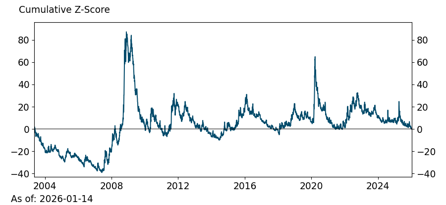 The Risk-On Risk-Off (RORO) Index is a multifaceted measure designed to capture the realized variation in global investor risk appetite. The measure uses daily data from asset markets in the United States and the euro area. It presents an aggregation of risk-on risk-off states of the world based on four broad categories reflecting variation in advanced economy credit risk, equity market volatility, funding conditions, and currencies and gold. To infer the overall risk-bearing capacity of international investors, the RORO Index comprises the first principle component of the daily changes in these series.