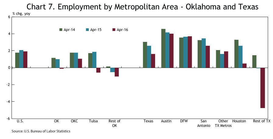 Oklahoma’s economy, as heavily dependent on the energy sector as any state prior to the recent downturn in oil prices, has performed relatively well compared with most other oil and gas states. The latest numbers on employment, GDP and income still show flat or only slightly declining activity in Oklahoma, while state tax revenues are down somewhat more. This is in contrast to North Dakota and Wyoming, for example, which had similar-sized oil and gas sectors as Oklahoma but experienced much sharper declines in economic activity. One oil and gas state, however, clearly has outperformed Oklahoma on virtually all measures—Texas. One reason is Texas' slightly more diversified economy, especially in several of its largest cities, which rely more on business services and less on oil and gas related manufacturing than Oklahoma.
