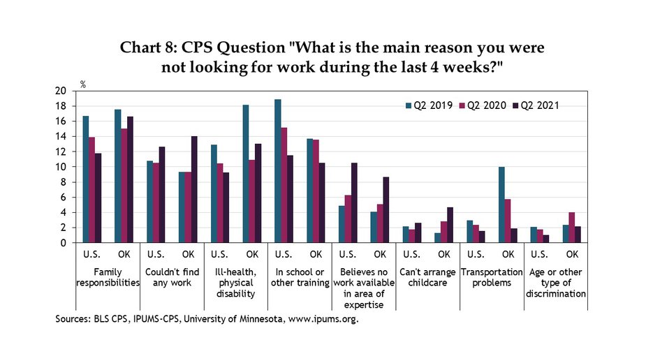 In conclusion, Oklahoma appears to have a much smaller share of workers on the sidelines than the country as a whole. Both the unemployment rate and the LFPR have returned nearly to pre-pandemic levels. Labor market data suggest the tightest markets are among those with college degrees, as well as those under 25 and those 45-54. As business continues to pick up, firms have increased wages and overtime to help fill the gap, and more also have invested in labor-saving technology. Firms also are working to reskill their workforces, but this, like automation, takes time. Survey data also show that some additional Oklahomans who are not in the labor force want jobs and are facing challenges that keep them from looking for work, such as family responsibilities or health issues. Addressing these and other long-term labor force participation trends in Oklahoma may require creative training opportunities and policy approaches in addition to traditional recruitment efforts.