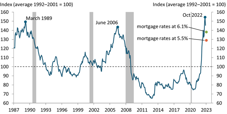 Lowering the ratio of homeownership costs to rents will require some combination of a decline in purchase prices, a decline in mortgage rates, and an increase in rents. Based on prices and rents in November 2022 and the 6.1 percent mortgage rate prevailing in early February 2023, home prices relative to rents are overvalued by 39 percent compared with the 1992–2001 benchmark (green dot in Chart 3). If mortgage rates were instead 5.5 percent, home prices would be overvalued by 29 percent (orange dot in Chart 3). If, in addition, owner-equivalent rents were 7.5 percent higher than in November 2022—their increase during the previous 12 months—prices would still be overvalued by 20 percent. Of course, the overvaluation would be considerably larger if benchmarked by the ratio of costs to rents just prior to the pandemic.