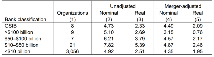 Next, we remove the effects of inflation and mergers to assess real organic growth—that is, asset growth after accounting for inflation and merger activity (Table 1, column 5). Again, the results differ by bank size. Real, merger-adjusted growth at the median large GSIB bank averaged just 2.1 percent annually from 2010:Q2 to 2024:Q4. Banks in the $50 to $100 billion asset class grew at a similar rate. However, large, non-systemically important banks—those with more than $100 billion in real merger-adjusted assets—grew by less than 1 percent annually, suggesting that inflationary effects and merger activity, not organic growth, drove much of their reported nominal growth. Average organic growth at smaller, mid-sized banks—those with assets between $10 and $50 billion—was slightly faster at 2.46 percent per year, while real community bank assets increased at about 2 percent per year.