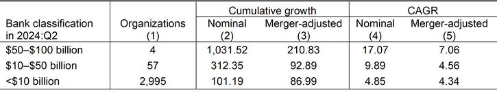 Second, we examine cumulative growth trends among banks that had fewer than $10 billion in assets in 2010:Q2. We find that, consistent with our earlier results, mergers are a key driver of rapid growth at small banks. Table 2 restricts our earlier analysis to only banks that had less than $10 billion in assets in 2010:Q2 and shows that, in total, 61 banks crossed the $10 billion threshold by 2024:Q4. Incredibly, four of these banks grew enough cumulatively to cross the $50 billion threshold. For the four fastest-growing banks, median cumulative growth was 17 percent per year on a nominal basis, while median merger-adjusted growth was about 7 percent per year. These figures imply that the banks that grew most rapidly in the post-GFC period did so by both acquiring existing banks and finding organic growth opportunities. However, acquisitions contributed more to overall growth than nominal, organic growth.